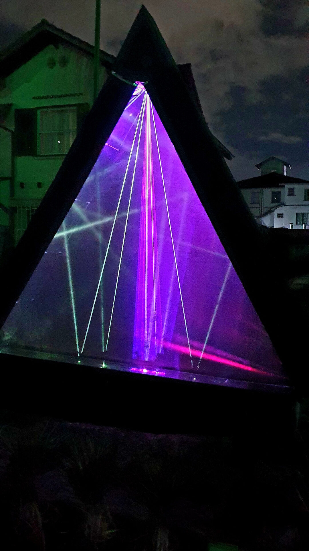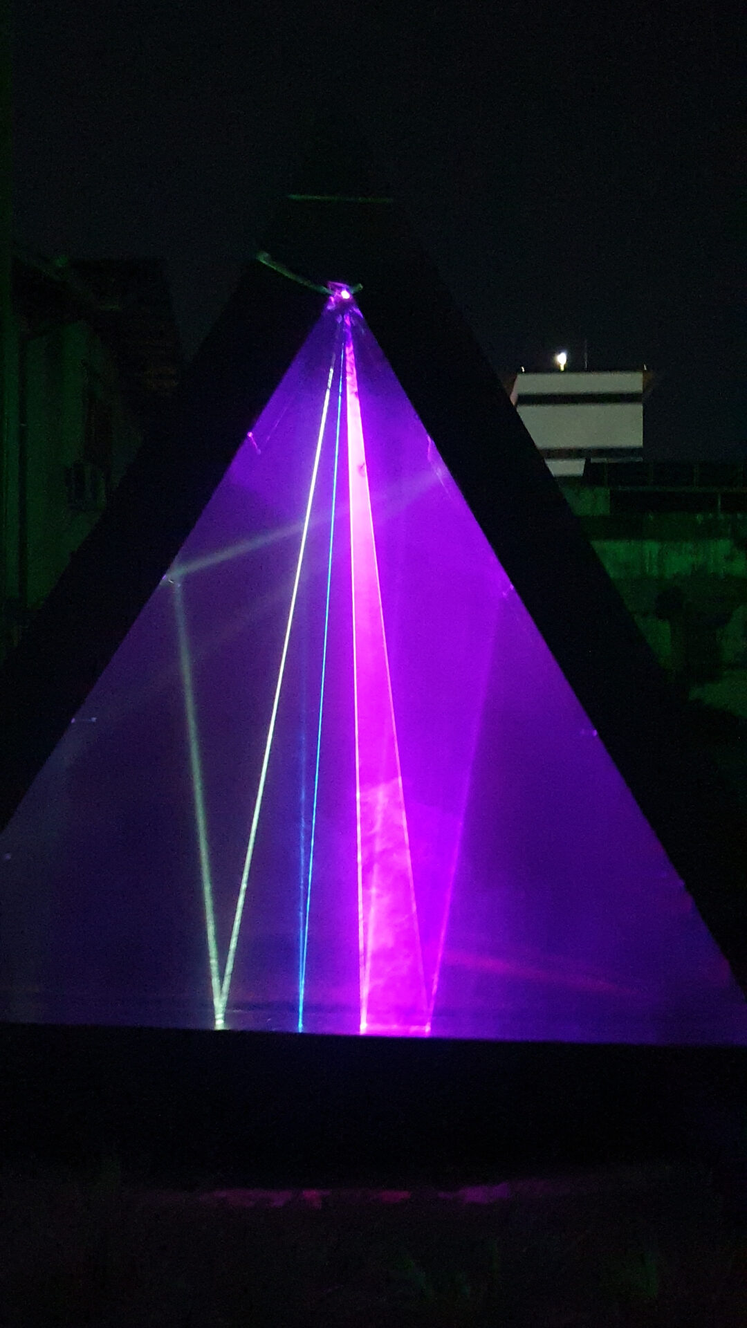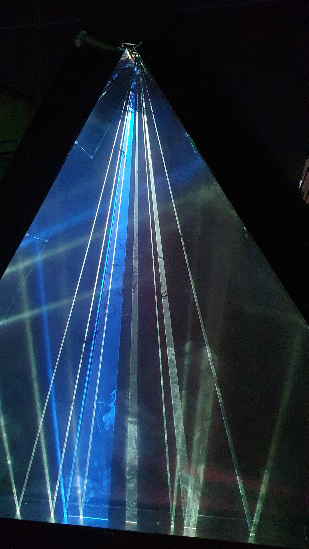 The structure is approximately 2.6 meters high and 3 meters wide, but can be built smaller if necessary. It consists of 15 mirrors fixed to a box truss structure. The laser generates shapes that reflect infinitely within the structure and is synchronized with the sound generated by the instruments.